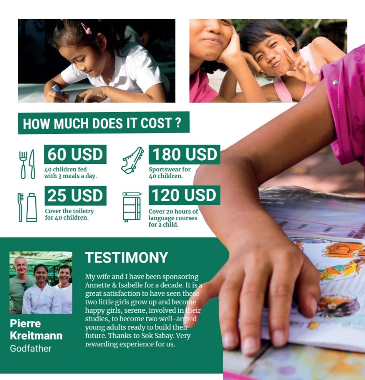 Between my humanitarian missions, I returned to France to work as a nurse in hospitals and clinics. By bicycle, I was looking for humanitarian sponsorships from pharmaceutical companies. It is with the help of the groups Sanofi and Beaufour Ipsen International and with my personal resources that Sok Sabay could have been founded. It is a long and constant struggle to ensure the most elementary human rights to children whose childhood has been ignored. These children are heroes because they have survived tragic situations. Their resilience allows them to overcome tragedies. Our action at Sok Sabay is to help them to overcome their suffering.